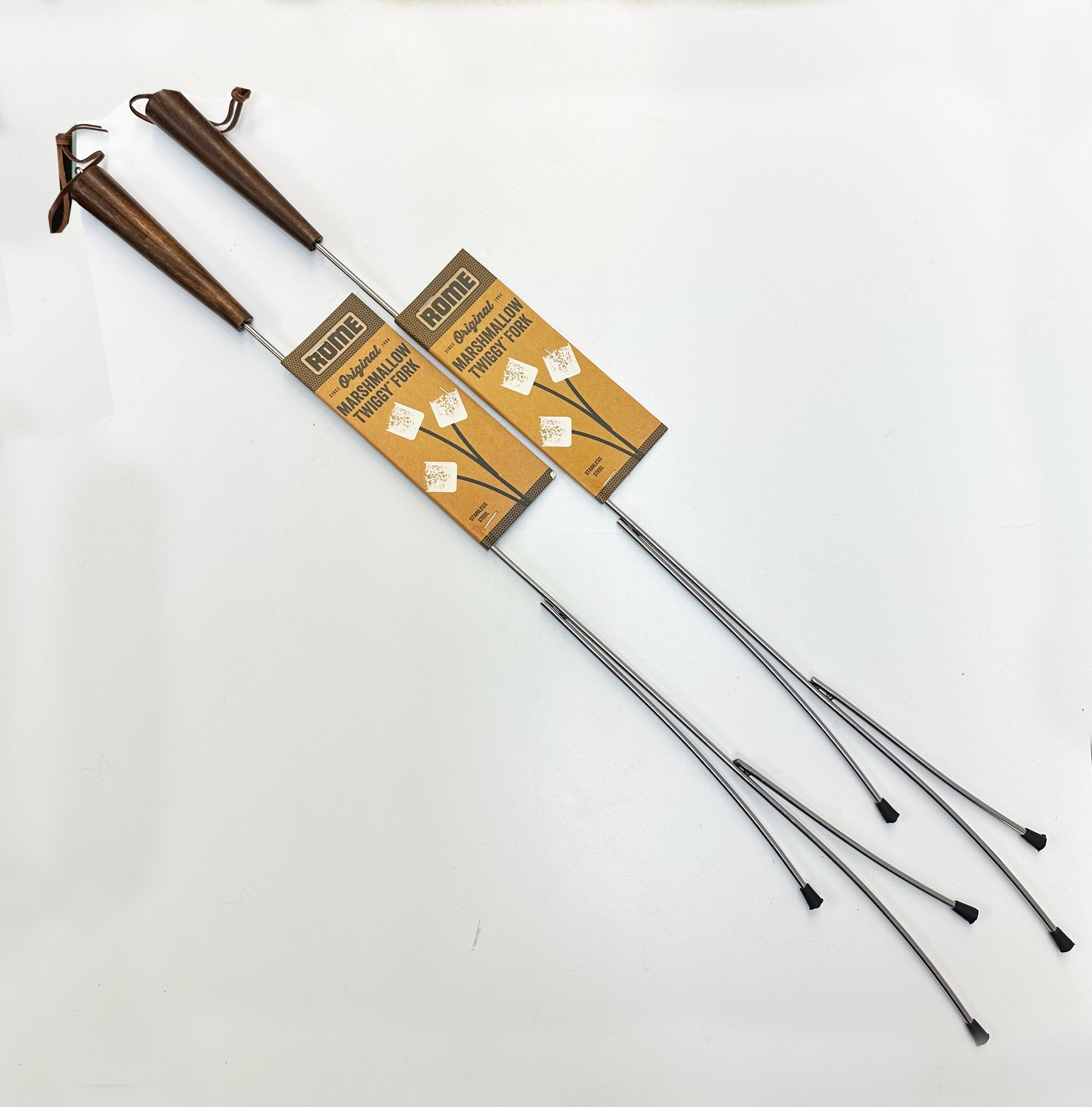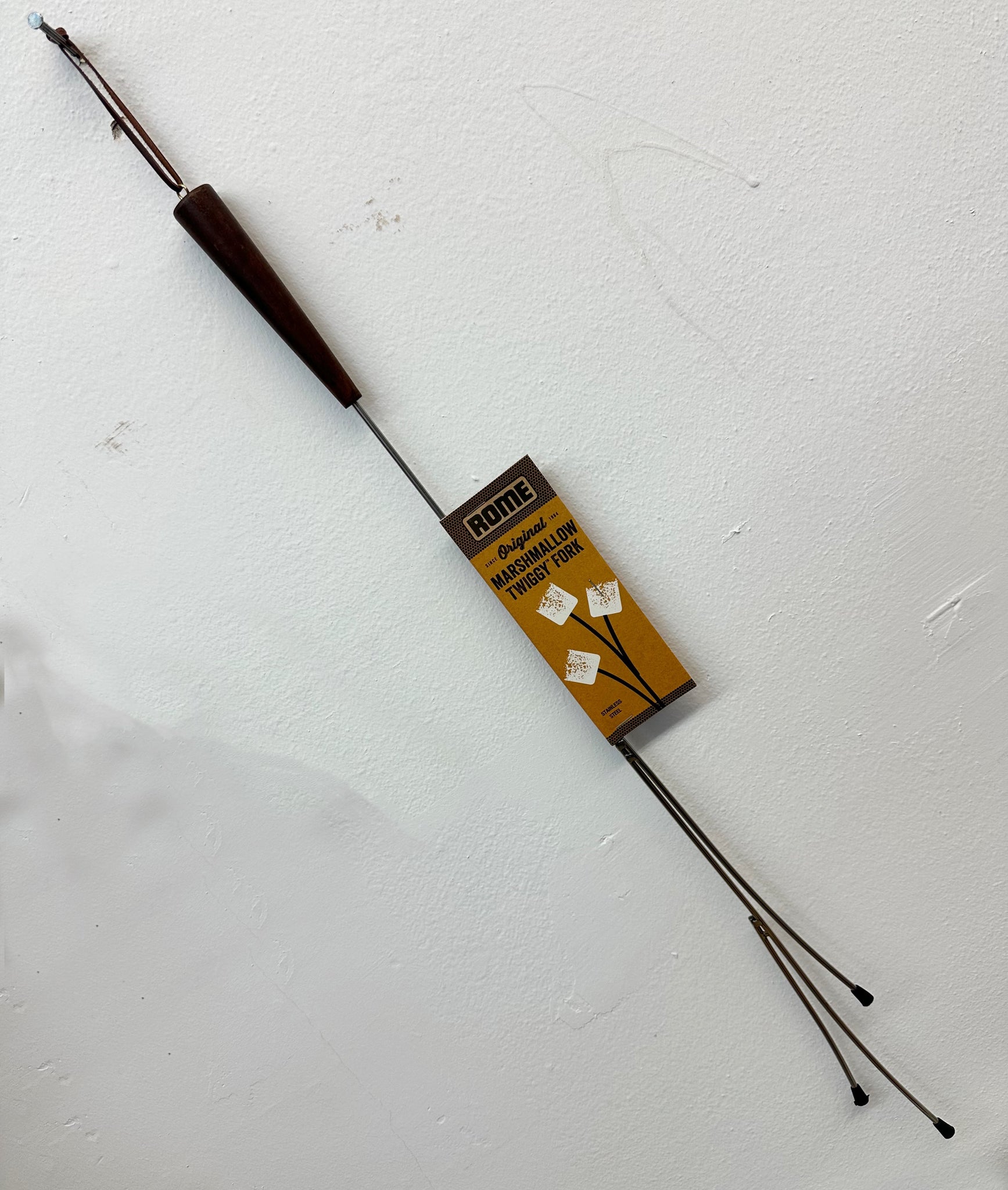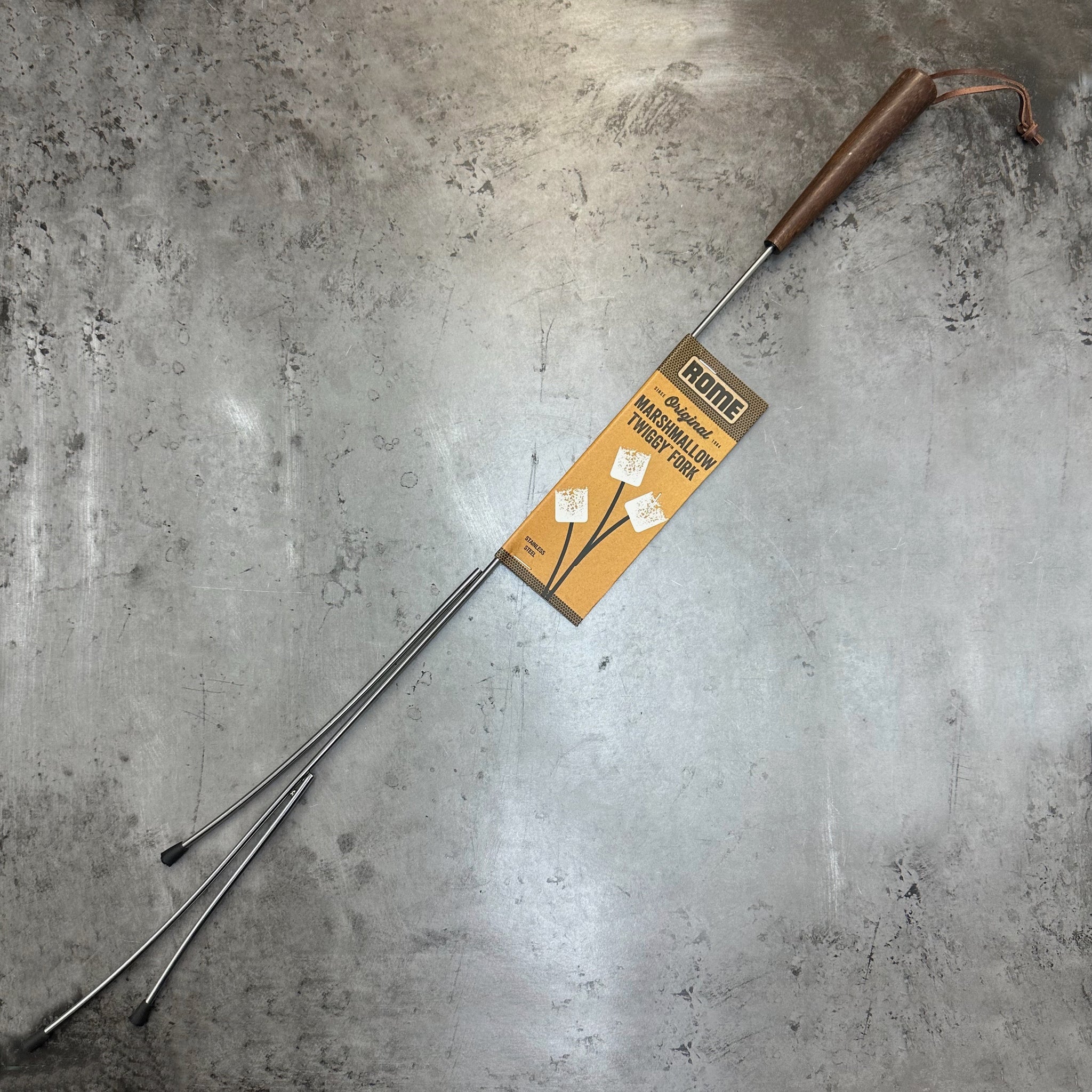 The Twiggy is an artistic marshmallow fork with modern branchlike tines. Made from stainless steel with eco-friendly, quality acacia wood handle. Leather strap is connected to handle with solid brass eyebolt. 28" length. Quality construction from top to bottom.